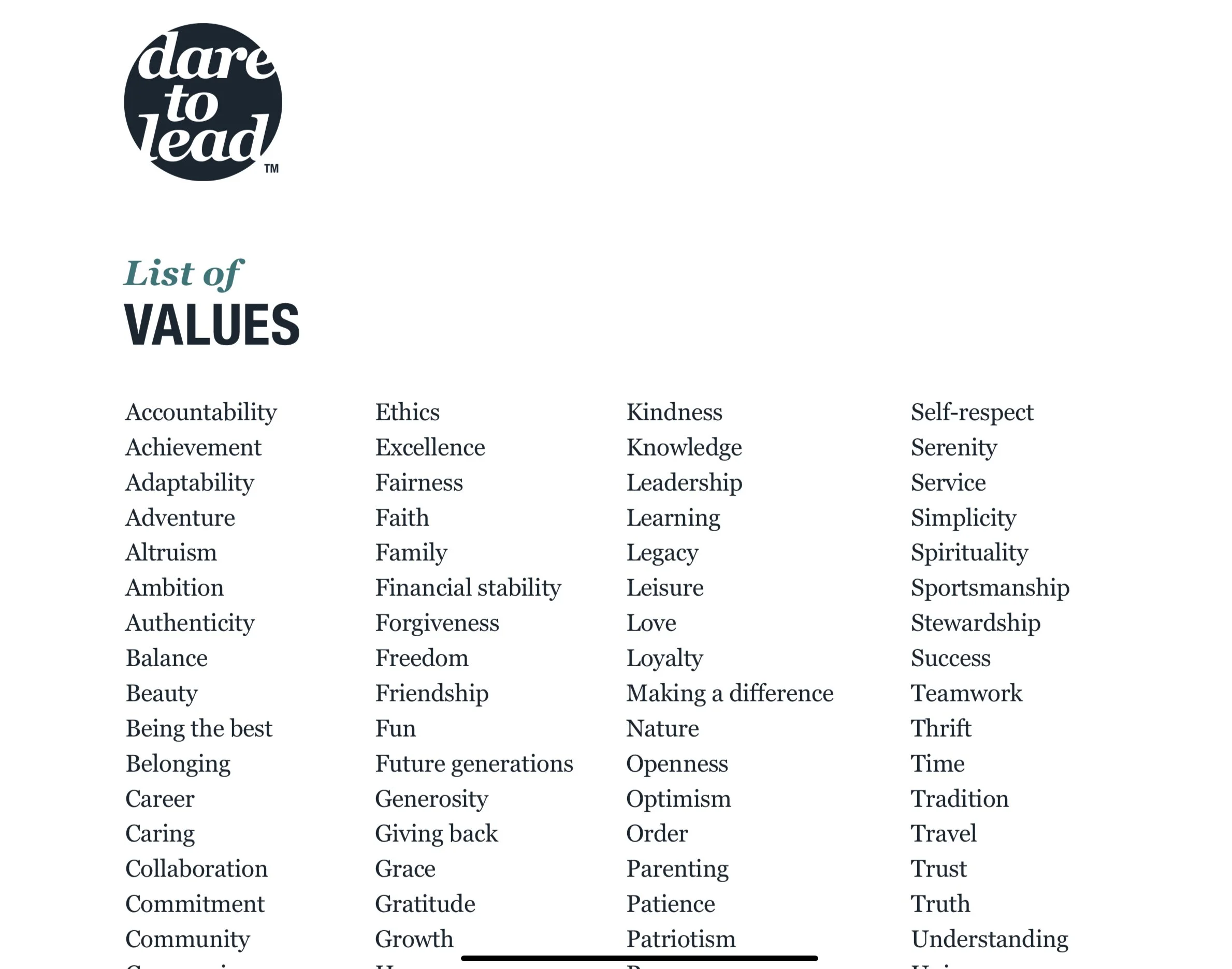 Dare to Lead Values List