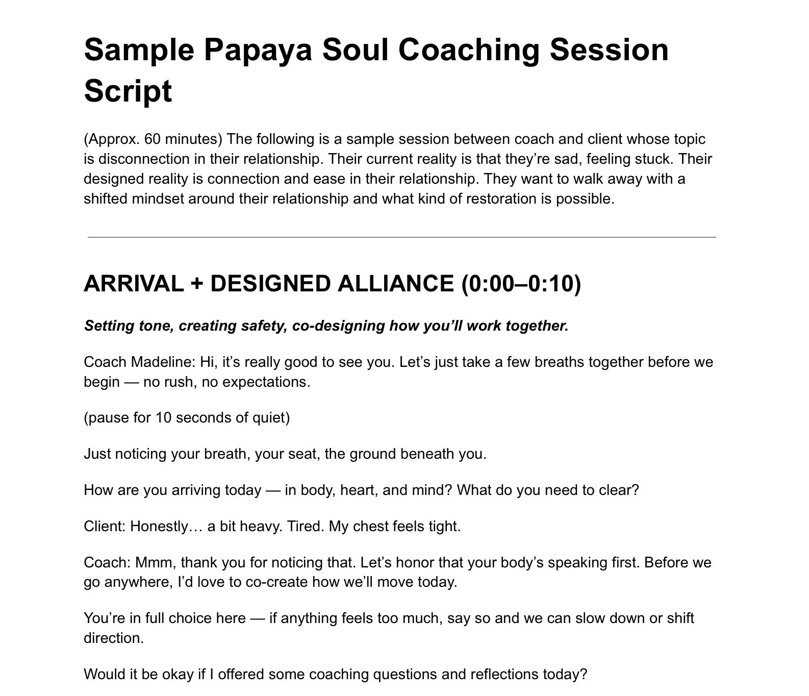 This part of the session regulates the nervous system, equalizes power, and invites co-creation. It’s where the client begins to remember that they are not being “coached at,” but rather co-creating transformation for themselves with a skilled coach.